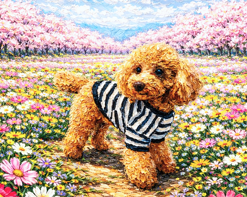 「桜並木」を背景にしてペットの姿を描きます。