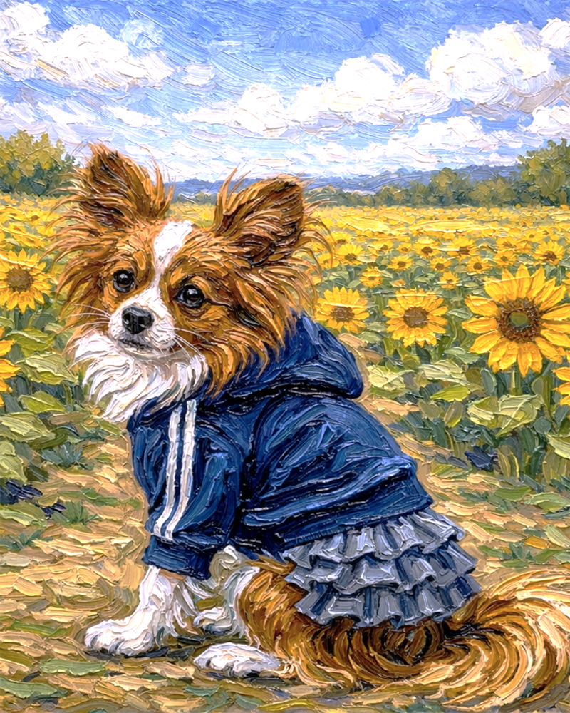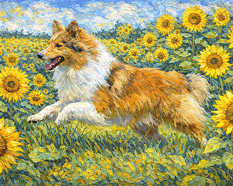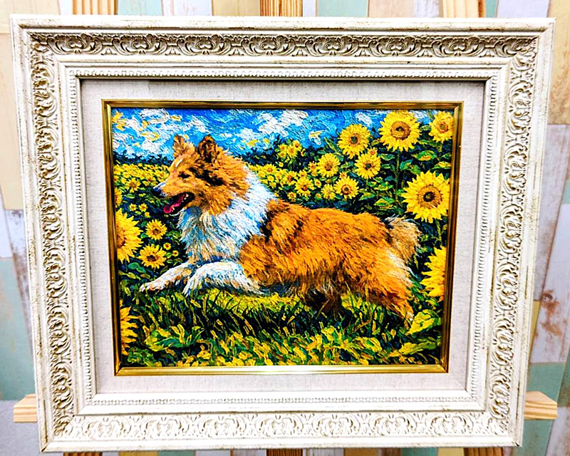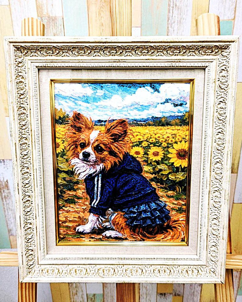 「ひまわり畑」を背景にしてペットの姿を描きます。