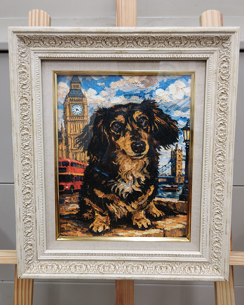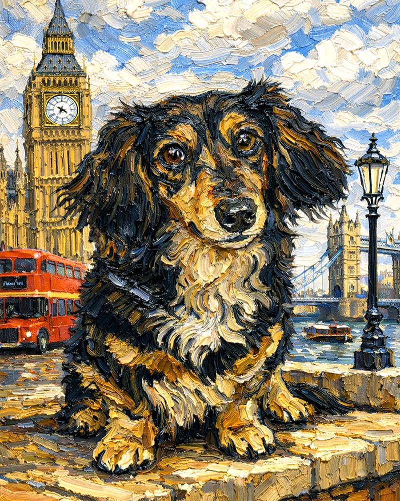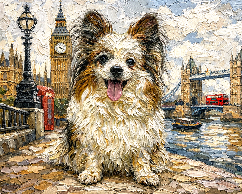 「ロンドンの風景」を背景にしてペットの姿を描きます。