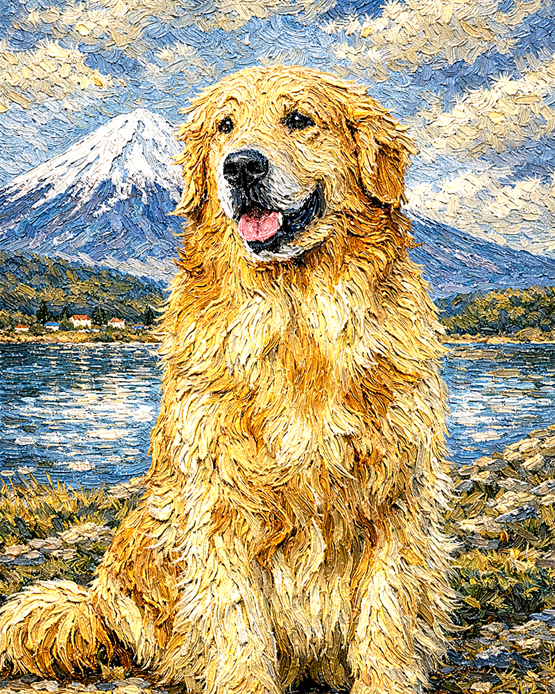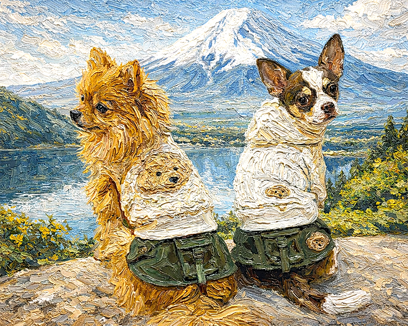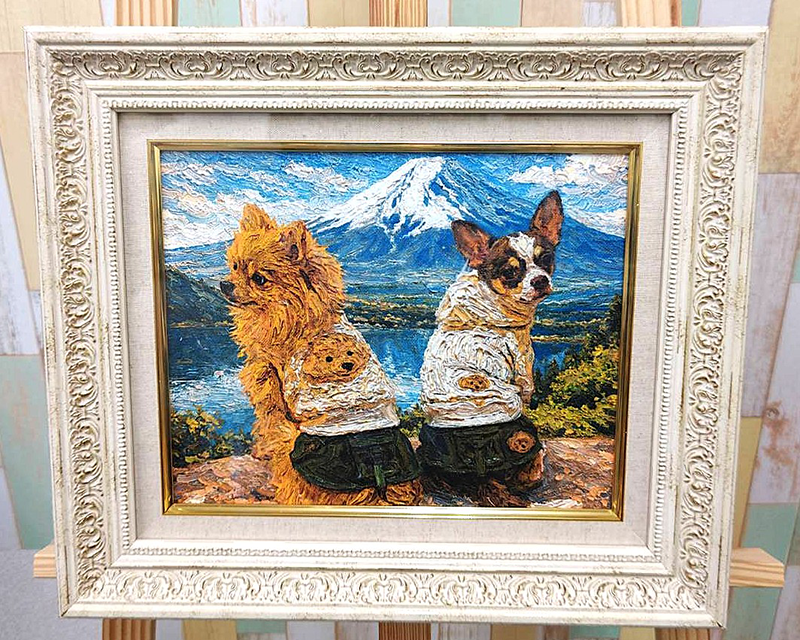「富士山」を背景にしてペットの姿を描きます。